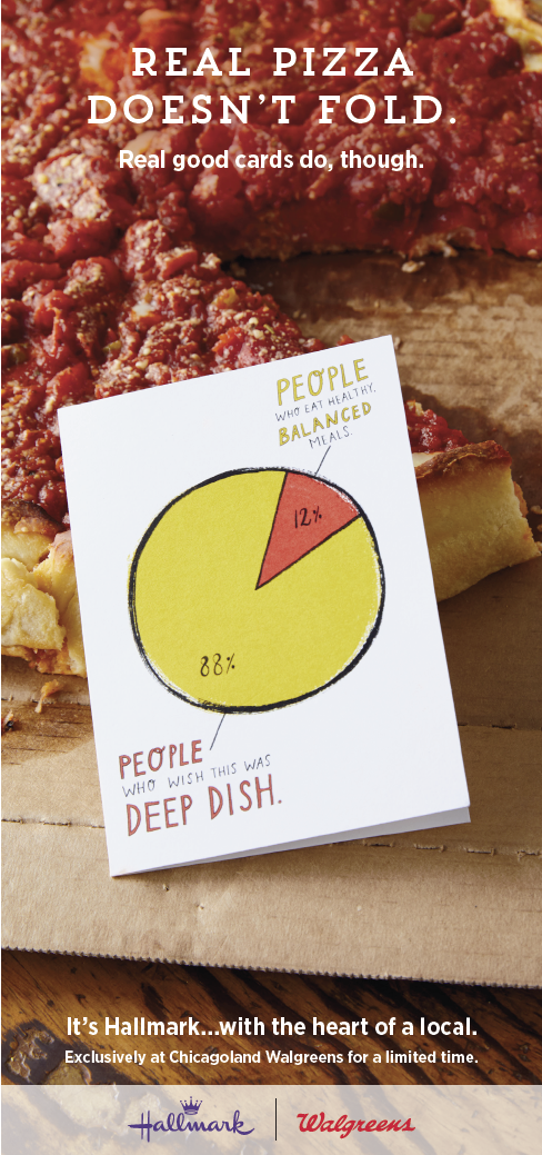 Having had the opportunity to live in Chicago for five years, I had a unique perspective that I was able to leverage in this ad copy, promoting a limited run of greeting cards specifically designed for local consumers and sold only in the the Chicago Walgreens flagship location.